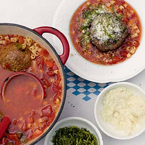 • Soups: Giant Meatball Soup in Beefy Tomato Broth; Crab Congee; Creamy Sausage Soup with Rapini and Tortellini; Caldo de Pollo